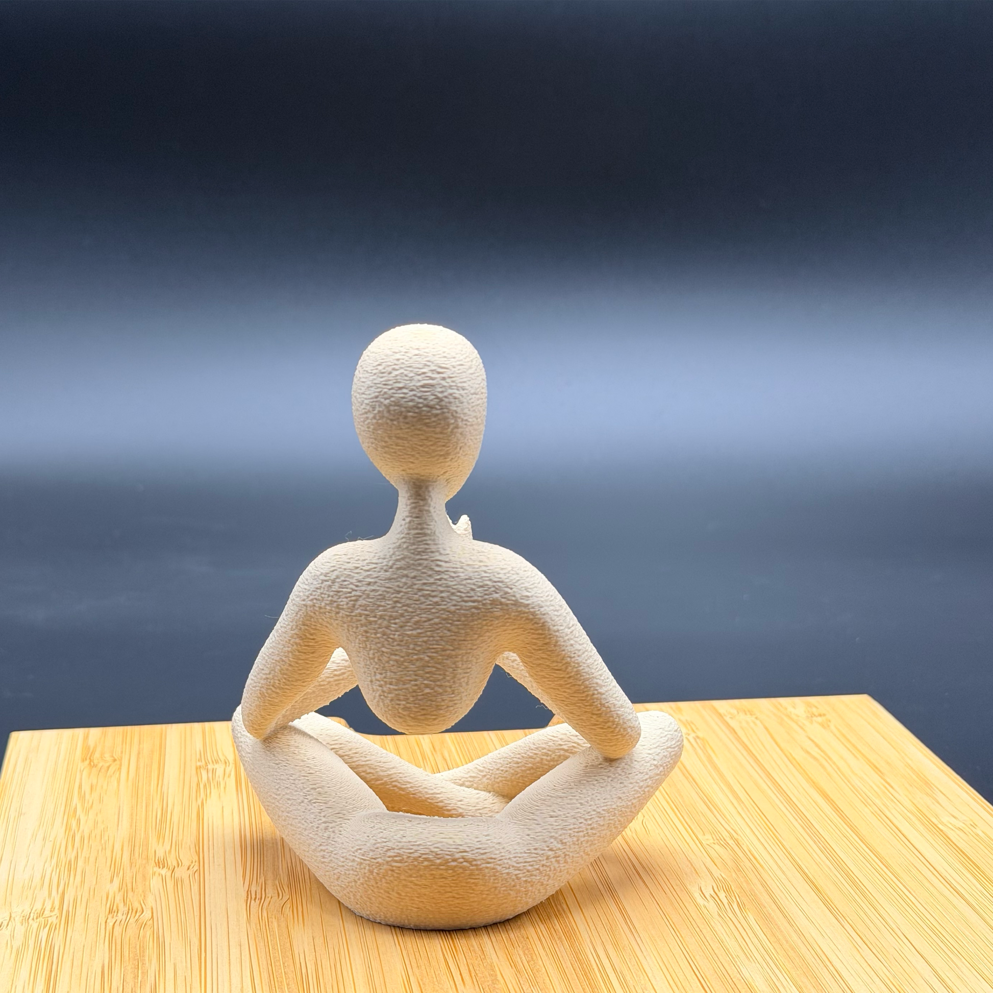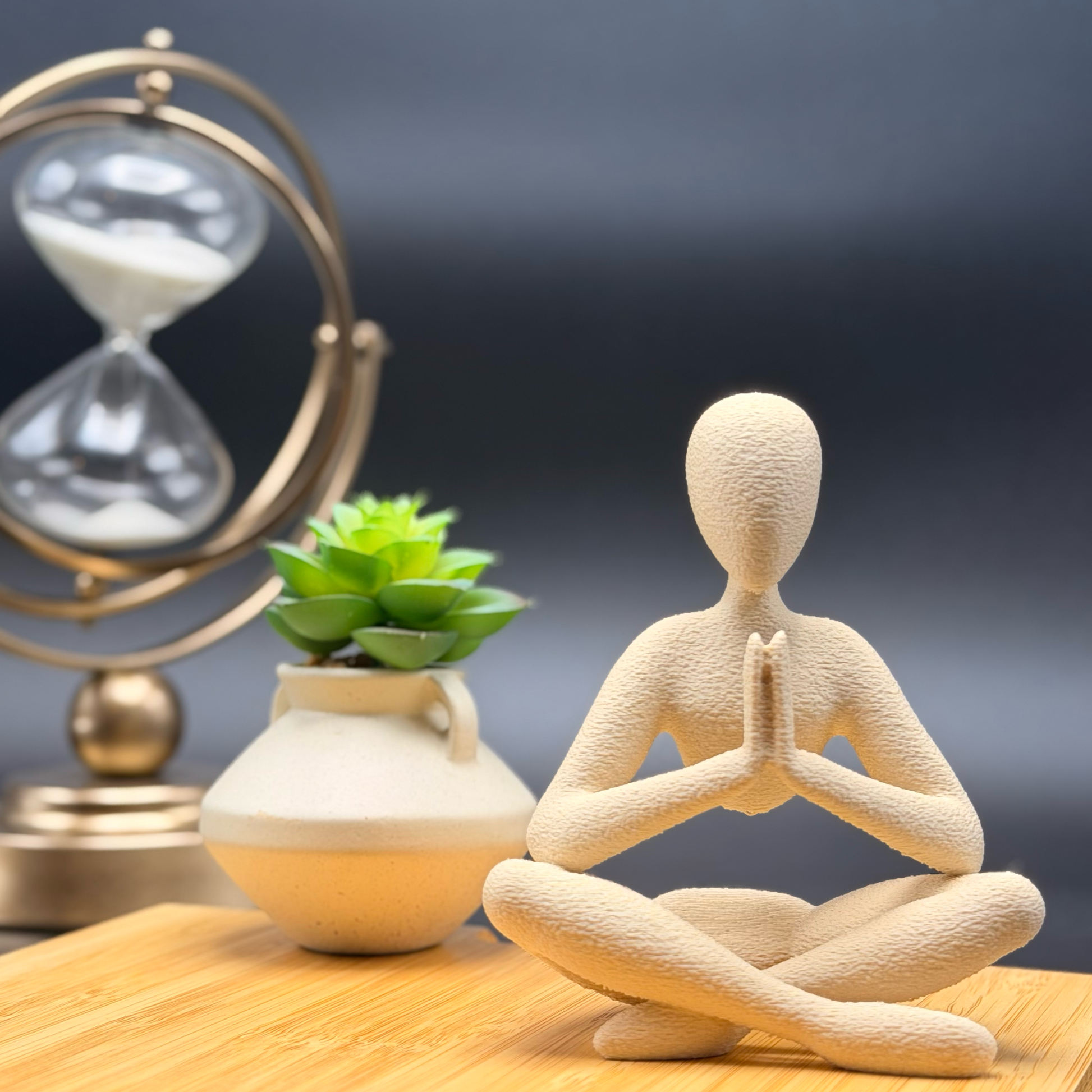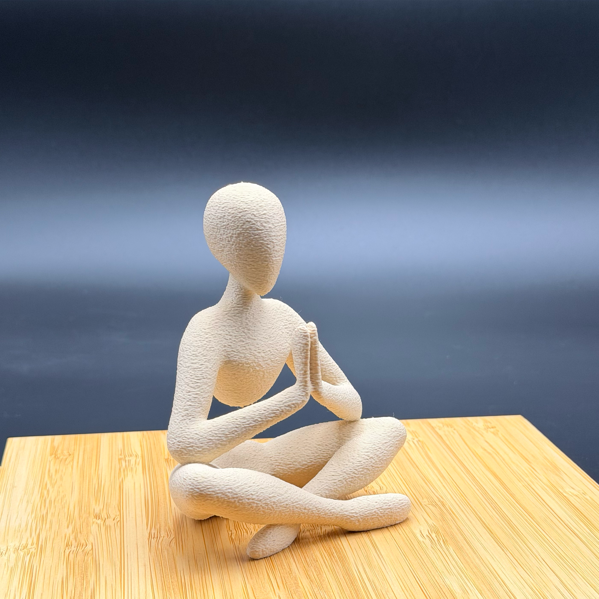 A serene 3D-printed sculpture featuring a minimalist figure in a meditative pose with hands in prayer. Its textured surface and calming design make it a perfect decorative piece for yoga studios, meditation spaces, desks, or modern home interiors.